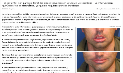 el gesto de masticación.Los autores principales de la investigación concluyen, en este sentido, que si bien " la reanimación de la parálisis facial depende de varios factores, entre los que la denervación (ausencia de conexión nerviosa) y la consecuente atrofia muscular son de gran importancia, sin embargo, el sexo del paciente también juega un papel relevante".La cirugía de la sonrisaLa cirugía de animación facial consiste en realizar un implante de un músculo del muslo a ambos lados de la cara, con lo que se consigue que los afectados puedan tener una sonrisa de forma voluntaria.La cirugía de la sonrisa puede beneficiar a afectados por parálisis facial congénita o adquirida.